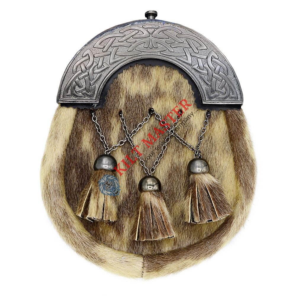 Material: Genuine Seal Skin Color: Natural Seal Skin Style: Antique Cantle Type: Scottish/Highland Tassels: 3 Fastening: Inside Button Attachment: Leather Straps and Chain Hardware: Antique Silver Finish Size: Adult and Adjustable