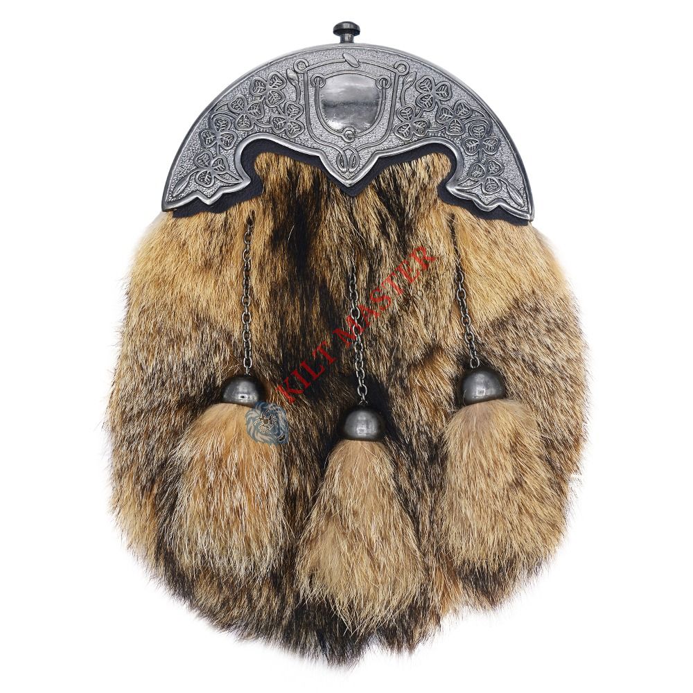 Material: Genuine Fox Fur Cantle Finish: Antique Cantle Design: Shamrock Style: Full Dress Type: Scottish/Highland Tassels: 3 Fur Tassels Fastening: Inside Button Clasp Attachment: Adjustable Leather Strap and Chain Hardware: Silver Chrome Size: Adult and Adjustable