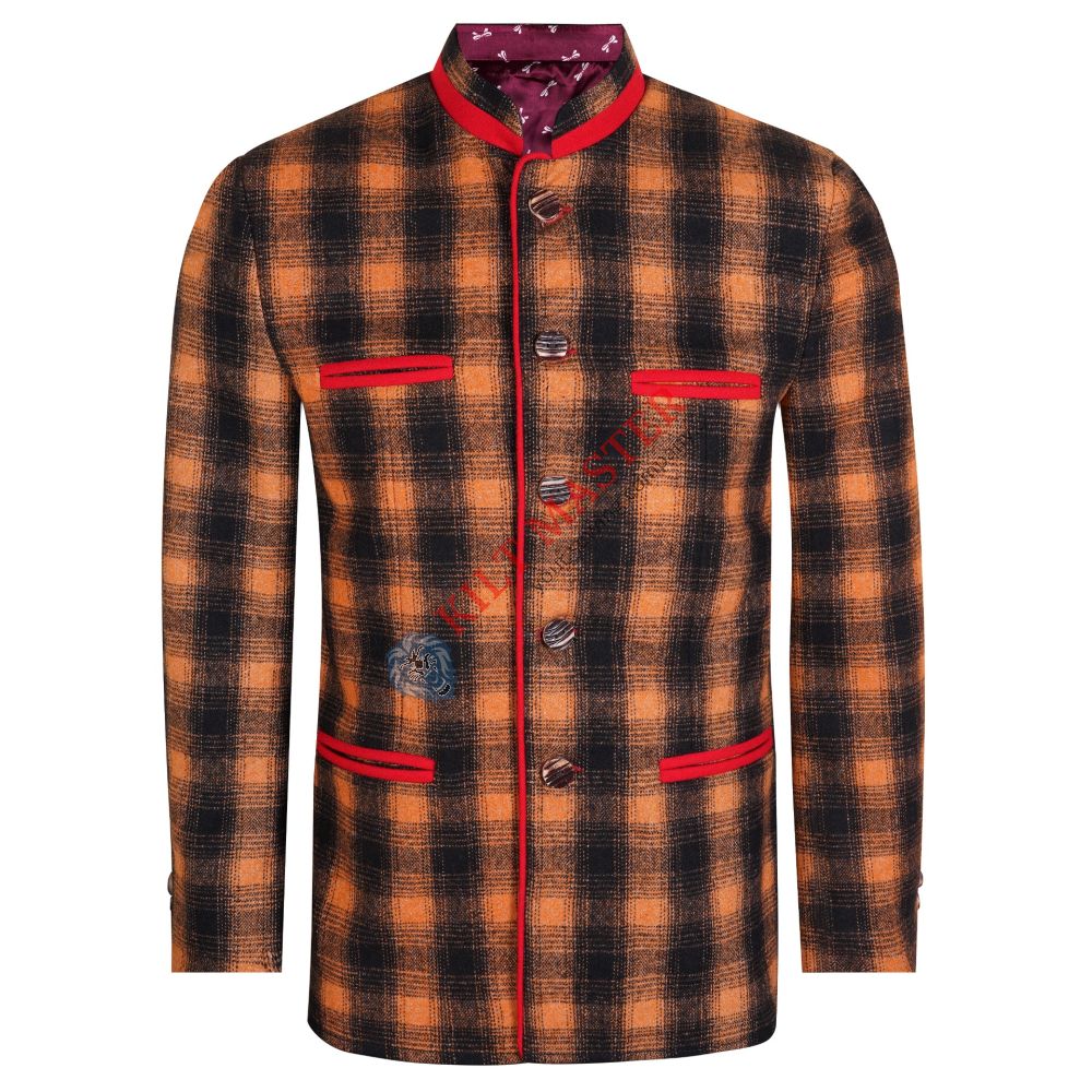This stylish warm jacket is made from high-quality wool, offering comfort and durability. Its black and orange color scheme gives it a unique German Trachten style that stands out. The jacket is designed for adults and made to measure, ensuring a perfect fit. It combines traditional German fashion with modern style, making it a versatile piece for many occasions. Whether you wear it for festivals or casual outings, it reflects authentic German Trachten wear with a contemporary twist. It’s a high-quality wool Bavarian jacket that keeps you warm and stylish at the same time.