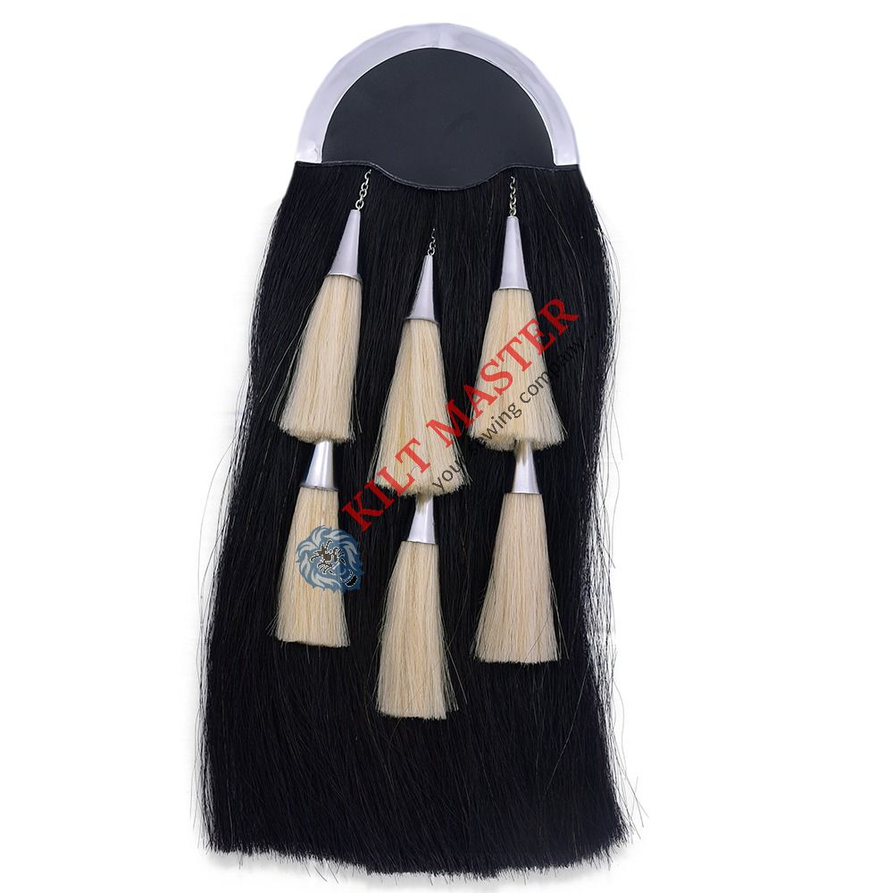 Material: The sporran is made from high-quality black horse hair, giving it a sleek and elegant look. Design: It features six white tassels that contrast beautifully with the black hair, creating a striking visual effect. Traditional Style: This sporran follows a classic design, making it ideal for both formal and informal events. Durability: The horse hair material is not only attractive but also highly durable, ensuring that the sporran will last for many years.