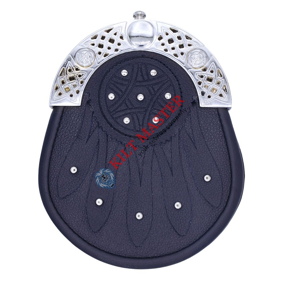 This sporran is a unique kilt accessory that combines high-quality black leather with striking Celtic chrome studs. Its gothic style adds a modern twist to traditional Scottish Highland fashion. Designed for adults, it is made to measure for a perfect fit. The adjustable size ensures comfort and a secure fit when worn with a kilt. Its vibrant design makes it a great choice for those who want to stand out and showcase their style confidently.