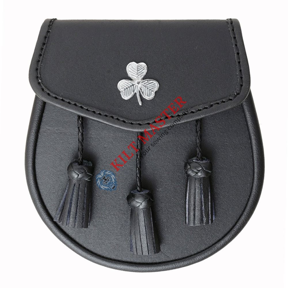 Material: Genuine Leather Color: Black Style: Handmade Type: Scottish/Highland Tassels: 3 Fastening: Inside Button Attachment: Leather Straps and Chain Hardware: Silver Chrome Size: Adult and Adjustable