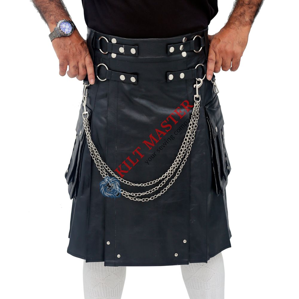 Material: High-Quality Genuine Leather Lining: Smooth Satin for Added Comfort Color: Classic Black Style: Utility/Fashion Kilt with a Modern Edge Type: Highland/Utility/Fashion Decorated: Hooks, Buttons, D-rings, Chain, Eyelets Pockets: Convenient Flapped Pockets with Secure Button Closure Fastening: Durable Button Fastening Hardware: Choose from Chrome, Gold, Black, or Antique Finish Size: Custom-Made to Fit Your Measurements