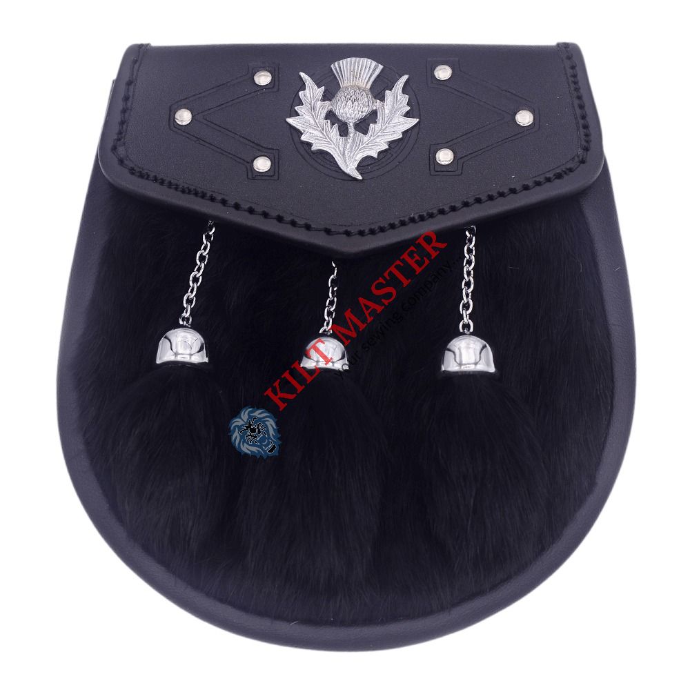 Material: Black Rabbit Fur Color: Black Style: Semi Dress Type: Scottish/Highland Tassels: 3 Fastening: Inside Button Attachment: Leather Straps and Chain Hardware: Silver Chrome Size: Adult and Adjustable