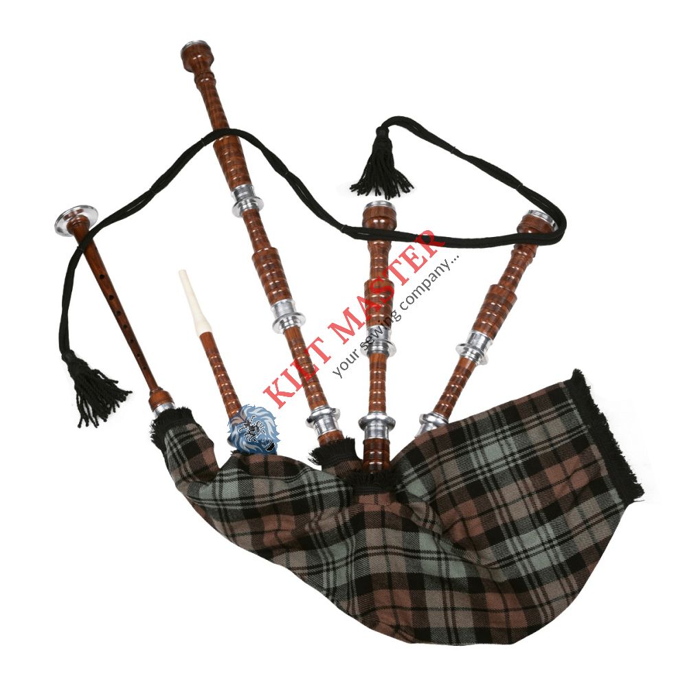 The Black Watch Weathered Tartan Scottish Bagpipe is handcrafted from premium rosewood, featuring a smooth natural finish and classic tartan cover, delivering authentic Scottish sound and timeless elegance.