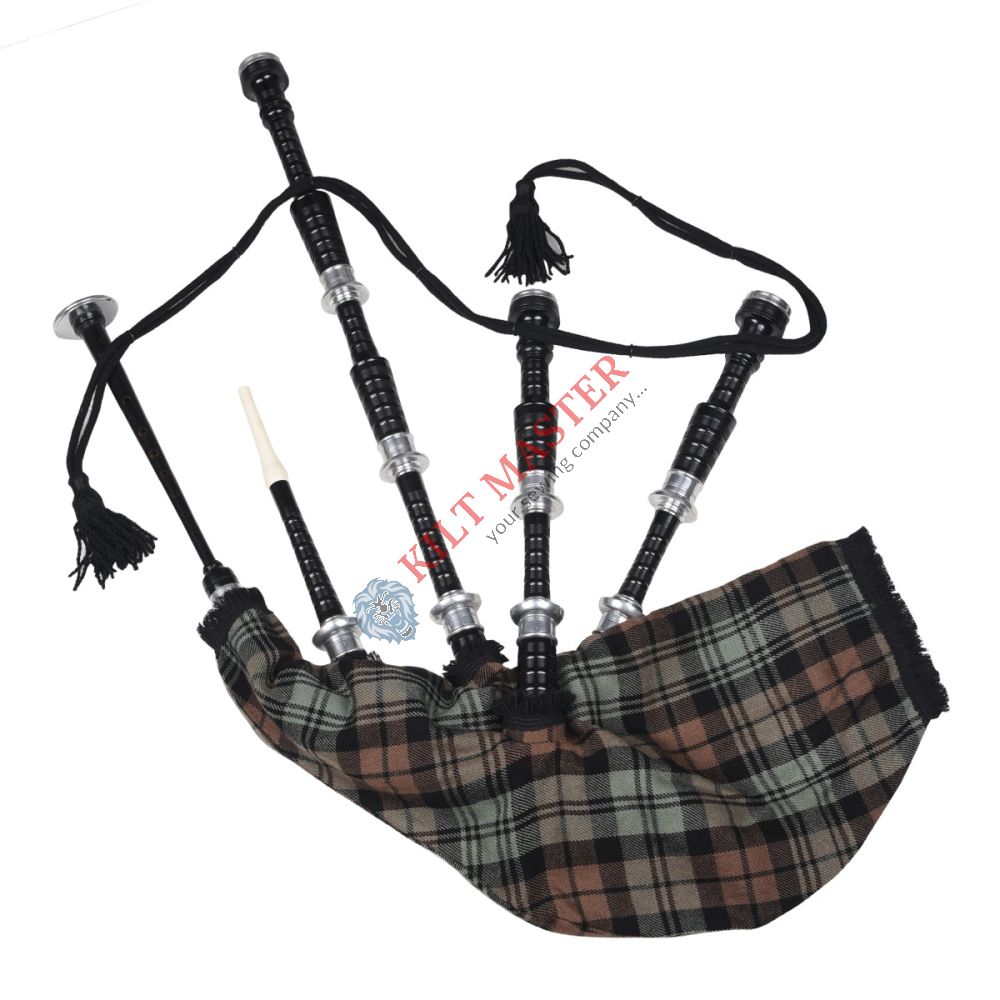 The Black Finish Black Watch Weathered Tartan Scottish Bagpipe has a classic look with a smooth black body. It gives clear sound, easy airflow, and steady performance for beginners and experienced players.