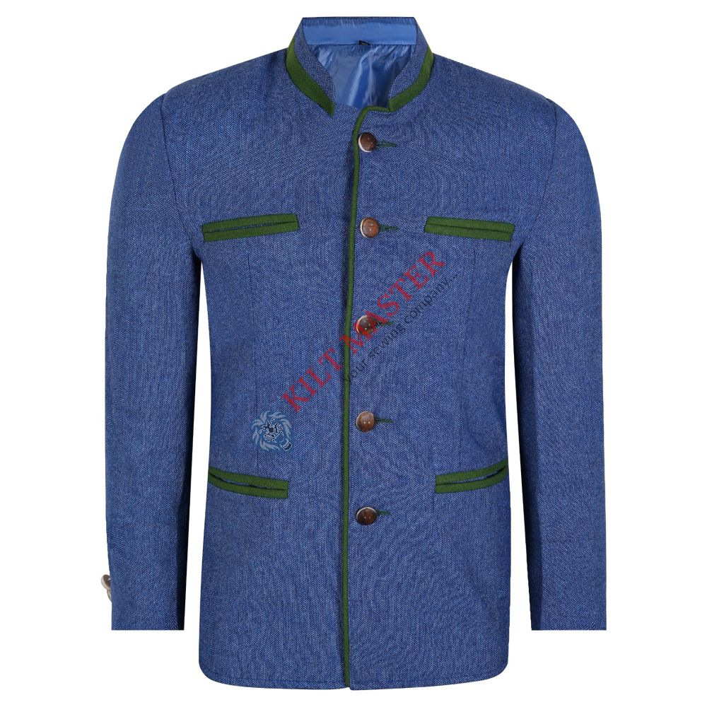 Material: Premium Blue Tweed Fabric: Premium Quality Tweed Style: Bavarian Type: Traditional German Lining: Satin Fastening: Front buttons Pockets: Stylish welt pockets Collar: Stand-up with optional embroidery Cuffs: Contrasted accents Inside Pockets: Two secure compartments Size: Made to Order