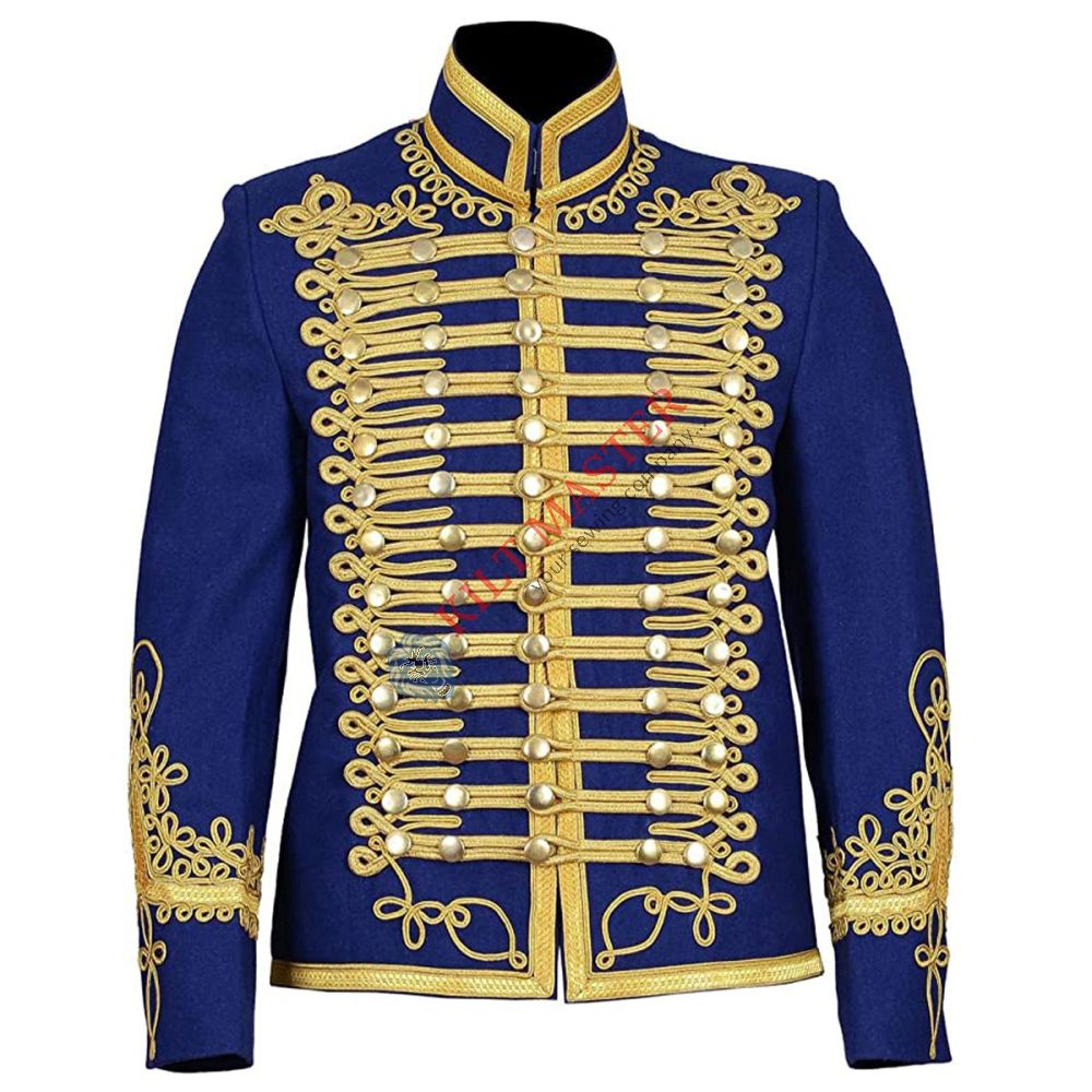Fabric: Premium Wool Accents: Gold Braid Style: Hussar Type: Doublet Jacket Fit: Tailored Design: Military Elegance Closure: Front Buttons Adjustability: Custom Fit Size: Made to Order