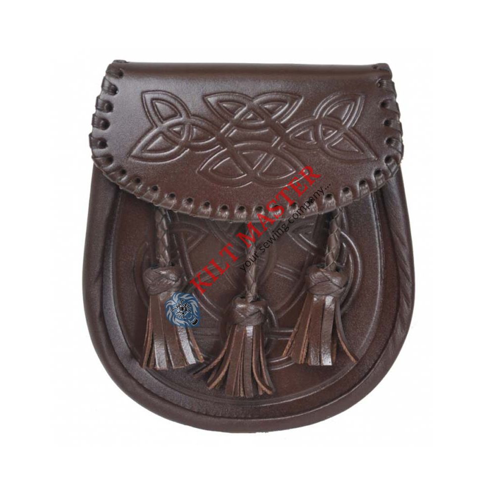Our Brown Embossed Leather Sporran is made from top-notch leather. Perfect for parties and events, it's designed to make any kilt outfit pop. The Celtic-themed embossed design works well with any fashion style or Tartan Kilt.