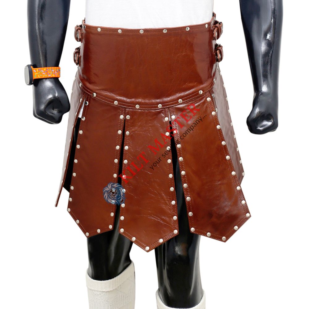 Brown Leather Kilt in Strapped Studded is made of high-quality cow or Buffalo leather in brown color. This Custom Brown Leather Kilt in Strapped Studded comes with adjustable belt fastening. Three middle panels are decorated with studs and others are decorated with eyelets. This is the best quality kilt that is manufactured for gladiators and their lovers. Kilt Master offers all types of kilts with custom options in size, color and hardware, so you can make an order as per your choice.