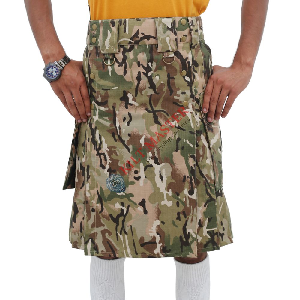 Material: 100% Cotton Fabric: Heavy duty Cotton Style: Tactical/Utility Type: Camouflage Kilt Pockets: Multiple cargo pockets Straps: Adjustable side straps for a secure fit Fastening: with buttons and belt loops Pleats: Deep pleats Length: Knee-length Customization: Made to Order
