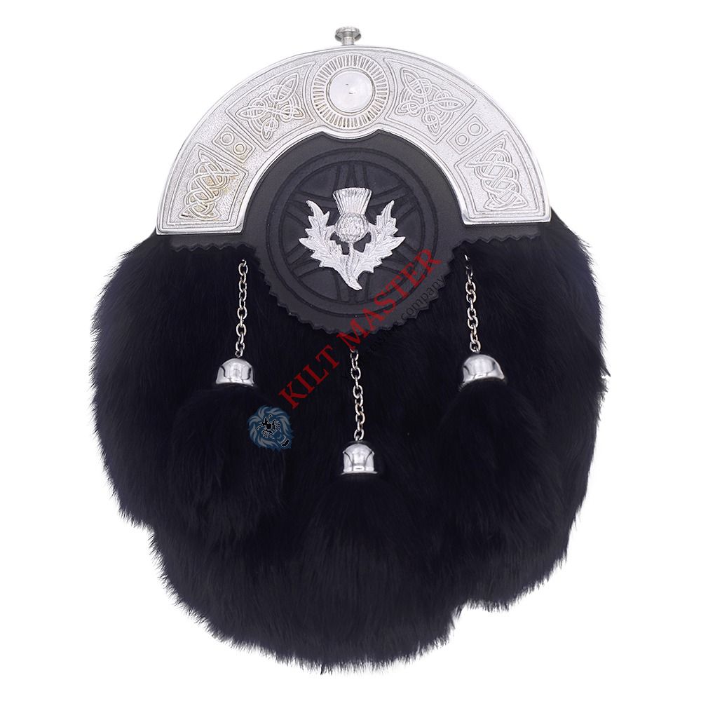 Material: Genuine Black Rabbit Fur Color: Black Style: Chrome Cantle with Thistle Badge Type: Scottish/Highland Tassels: 3 Fastening: Inside Button Attachment: Leather Straps and Chain Hardware: Silver Chrome Size: Adult and Adjustable Kilt Master is the Ultimate Scottish Clothing and Accessories Shop that offers an Extensive Range of High-Quality Custom Made Outfits. We provide kilt sporrans that are essential for completing your kilt attire.