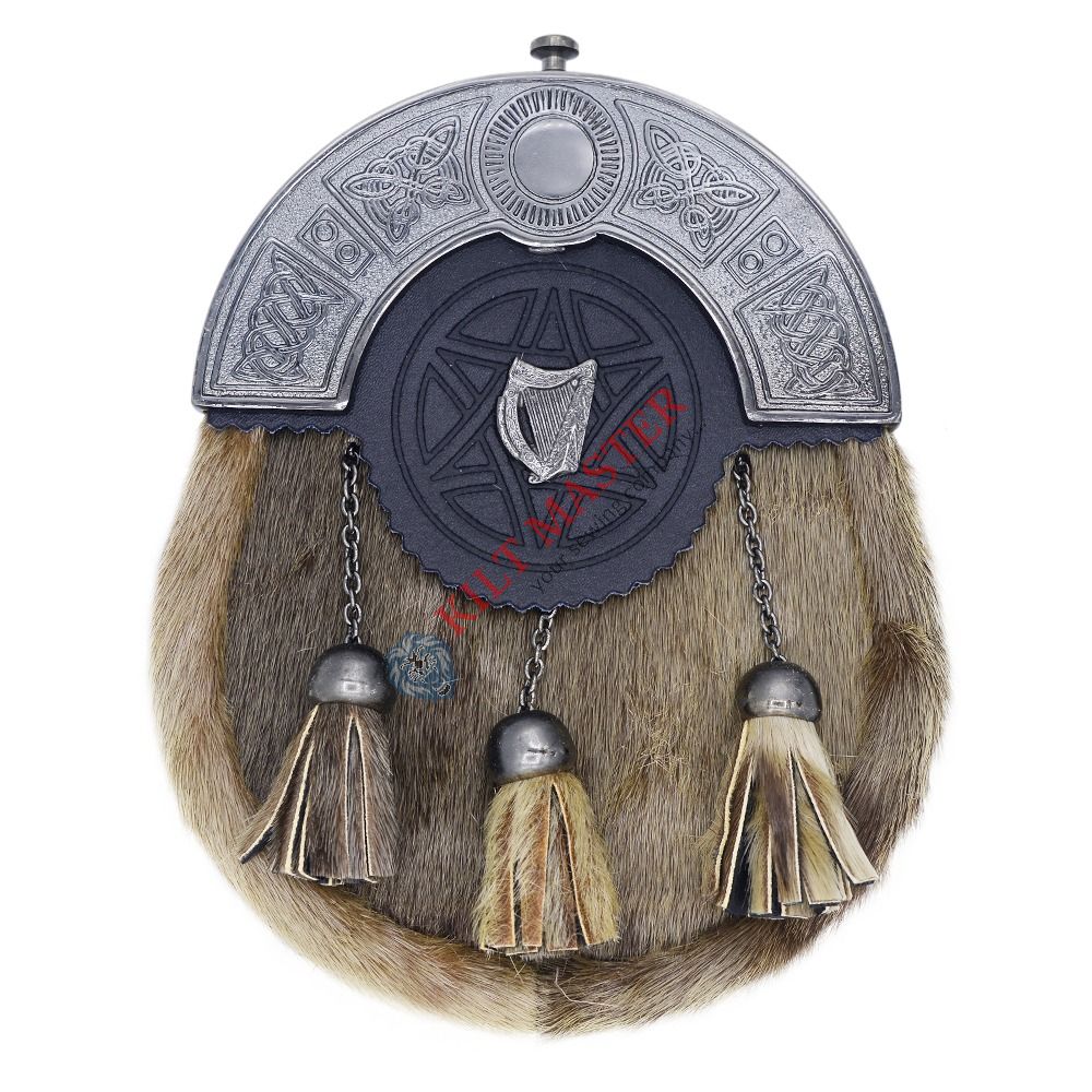 Chrome Cantle Scottish Seal Skin Sporran with Harp Brooch is a premium accessory crafted from genuine seal skin. This full dress sporran is perfect for formal occasions and events, enhancing the elegance and traditional look of your kilt ensemble. The unique Chrome Cantle design, combined with a harp brooch, adds a touch of Scottish heritage and sophistication. This sporran comes with a free adjustable leather strap and chain, ensuring a perfect fit for all.