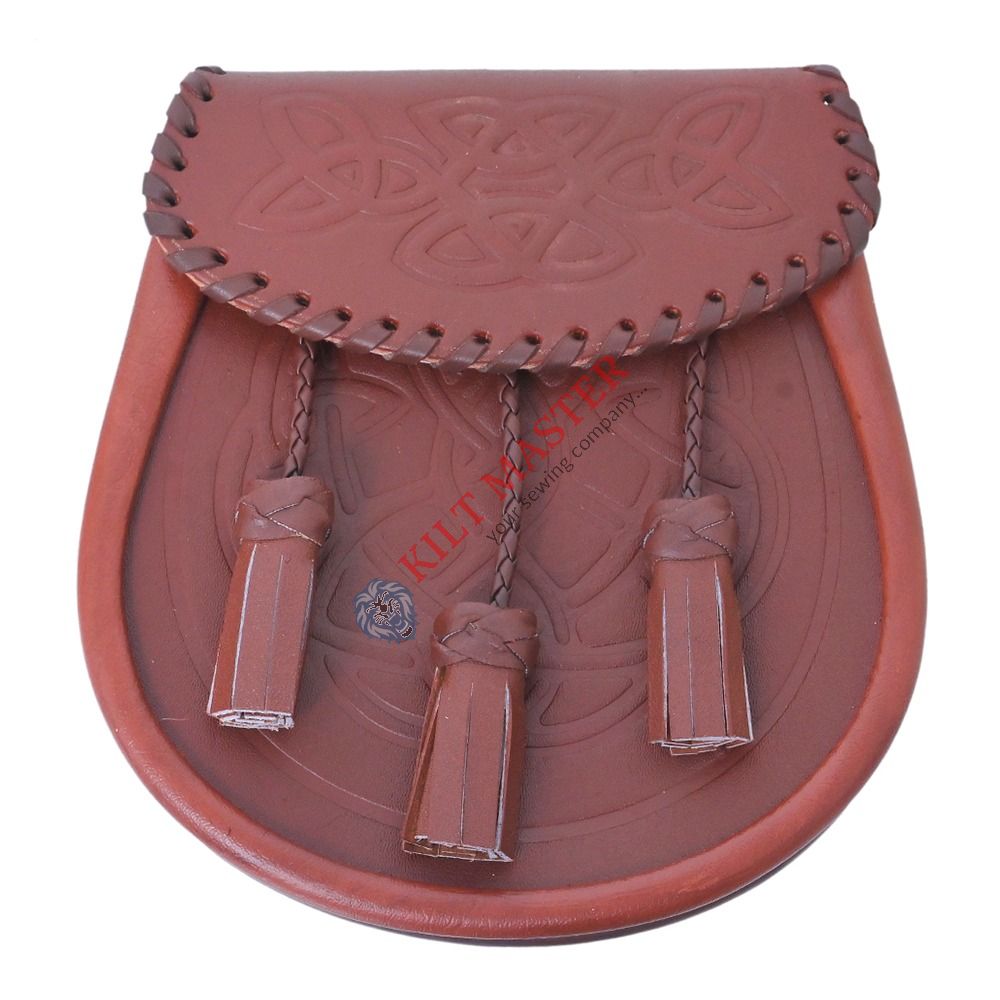 This sporran has a classic design inspired by the Wallace clan. It features three stylish tassels that give it a unique look. The tassels are securely attached and won't come loose. The design also includes intricate Celtic patterns, adding a touch of elegance.