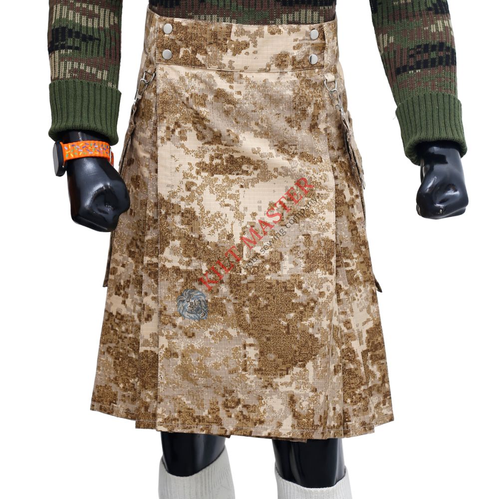 To keep your fashionable desert kilt looking its best, follow the care instructions provided. Usually, it is best to wash it in cold water with gentle detergent. Avoid bleach to preserve the camouflage colors. Air drying is recommended for longer-lasting fabric quality. If your kilt has detachable pockets, remove them before washing. Iron on low heat if needed to keep it looking sharp. Proper care ensures your stylish camo kilt stays vibrant and durable with continued use. Regular cleaning will also help maintain its appearance and fit for many wears.