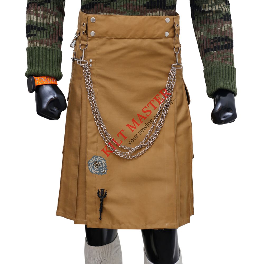 Features: Material: 100% Cotton Color: Khaki Style:Fashion Kilt Type: Scottish/Highland Pocket: Round Pocket for Utility Fastening: Buttons Decorated: Chain, D- Rings, Hooks Hardware: Select Your Option Belt loops: Yes Size: Made to Order