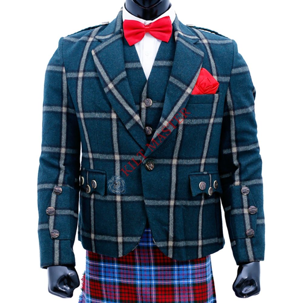 Features: Material: 100% Wool Fabric: Tweed Style: Argyle Type: Scottish/Highland Lining: Satin Buttons: Bone Chest Pocket: 1 on Left Side Side Pockets: Flapped with 3 Buttons Each Epaulets: Braided with 1 Button Cuffs Style: Argyle with 3 Buttons Each Inside Pockets: 2 Vest Buttons: 5 Vest Pockets: 2 Outside Vest Back: Satin with Waist Adjusting Belt Size: Made to Order