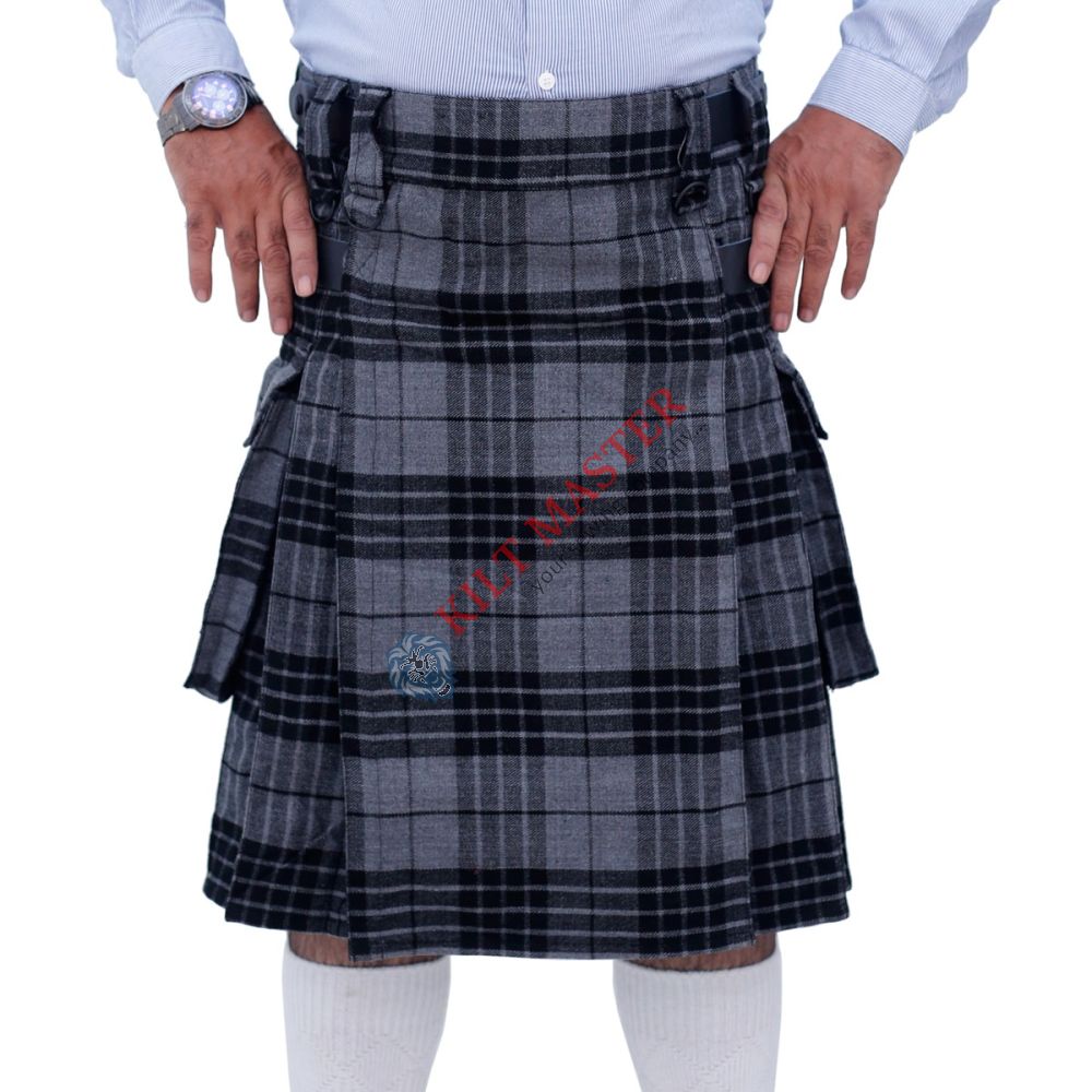 Enhance your style with our Grey Watch Tartan Utility Kilt, featuring comfortable tartan fabric, adjustable leather straps, and multiple utility pockets. Perfect for any occasion!