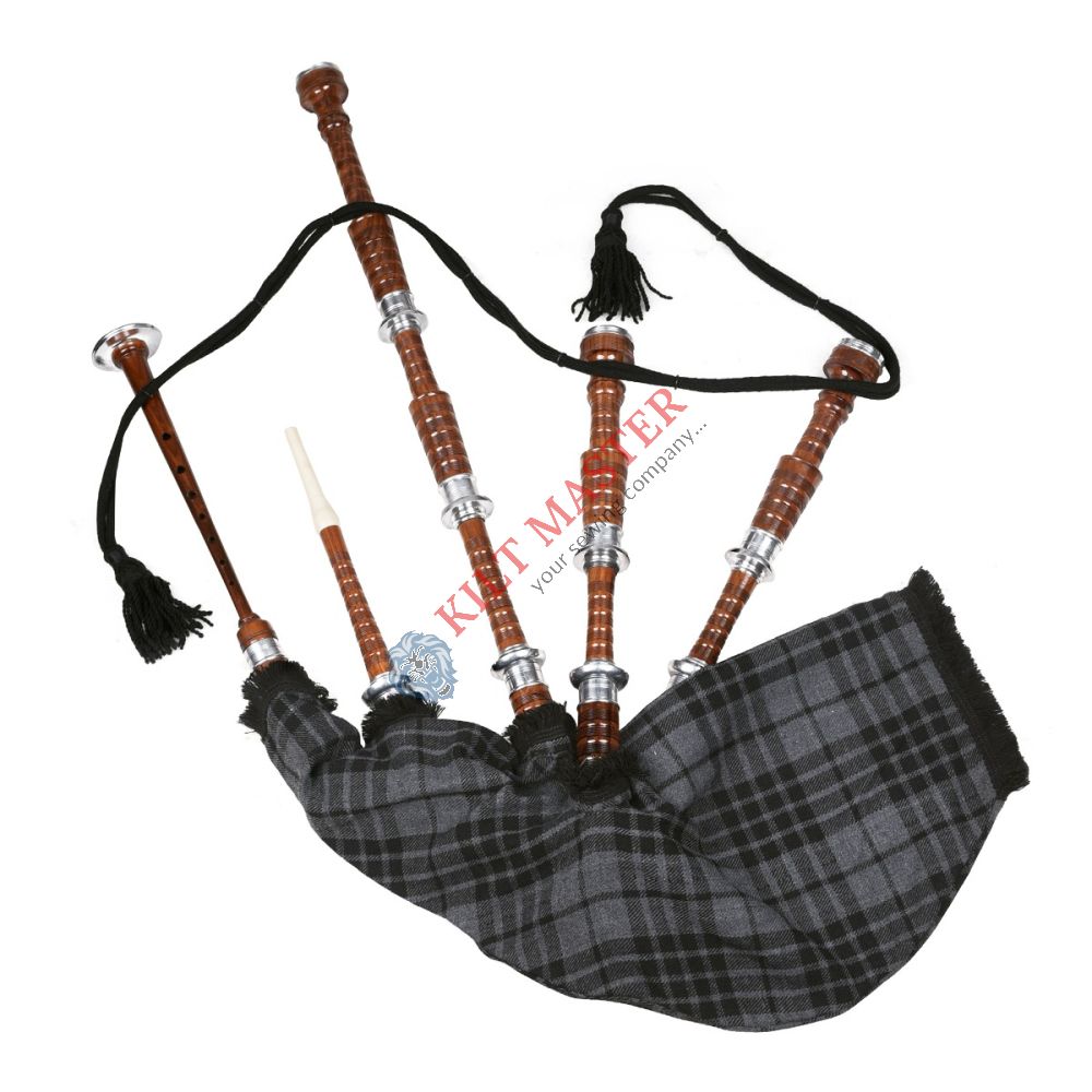 The Grey Watch Tartan Scottish Bagpipe is a handcrafted rosewood instrument with a natural finish and imitation ivory mounts for a traditional look. It delivers professional sound quality and features a striking Grey Watch Tartan cover. Silver-finished alloy ring caps and ferrules add a touch of elegance, making it both beautiful and authentic.