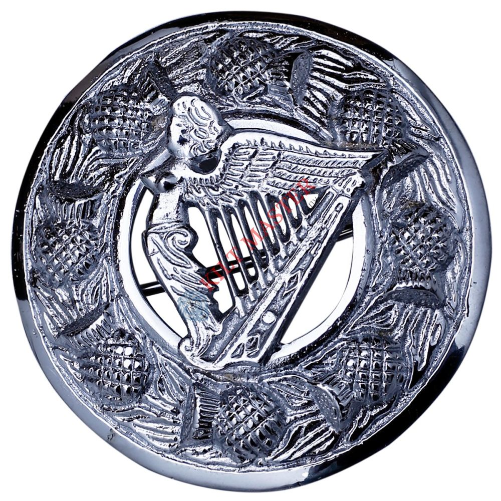 Introducing the Lady Harp Kilt Fly Plaid Brooch with a shiny chrome finish! This brooch is crafted with durable chrome and showcases a breathtaking harp design. Its detailed craftsmanship lends an air of delicate sophistication to your kilt outfit.