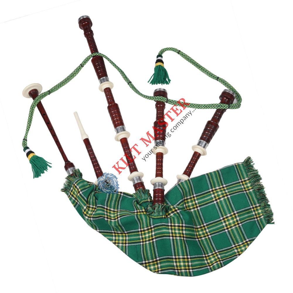 The Rosewood Irish National Tartan Bagpipe is a handcrafted instrument with a rich tone and authentic Irish tartan, perfect for performances and collectors.