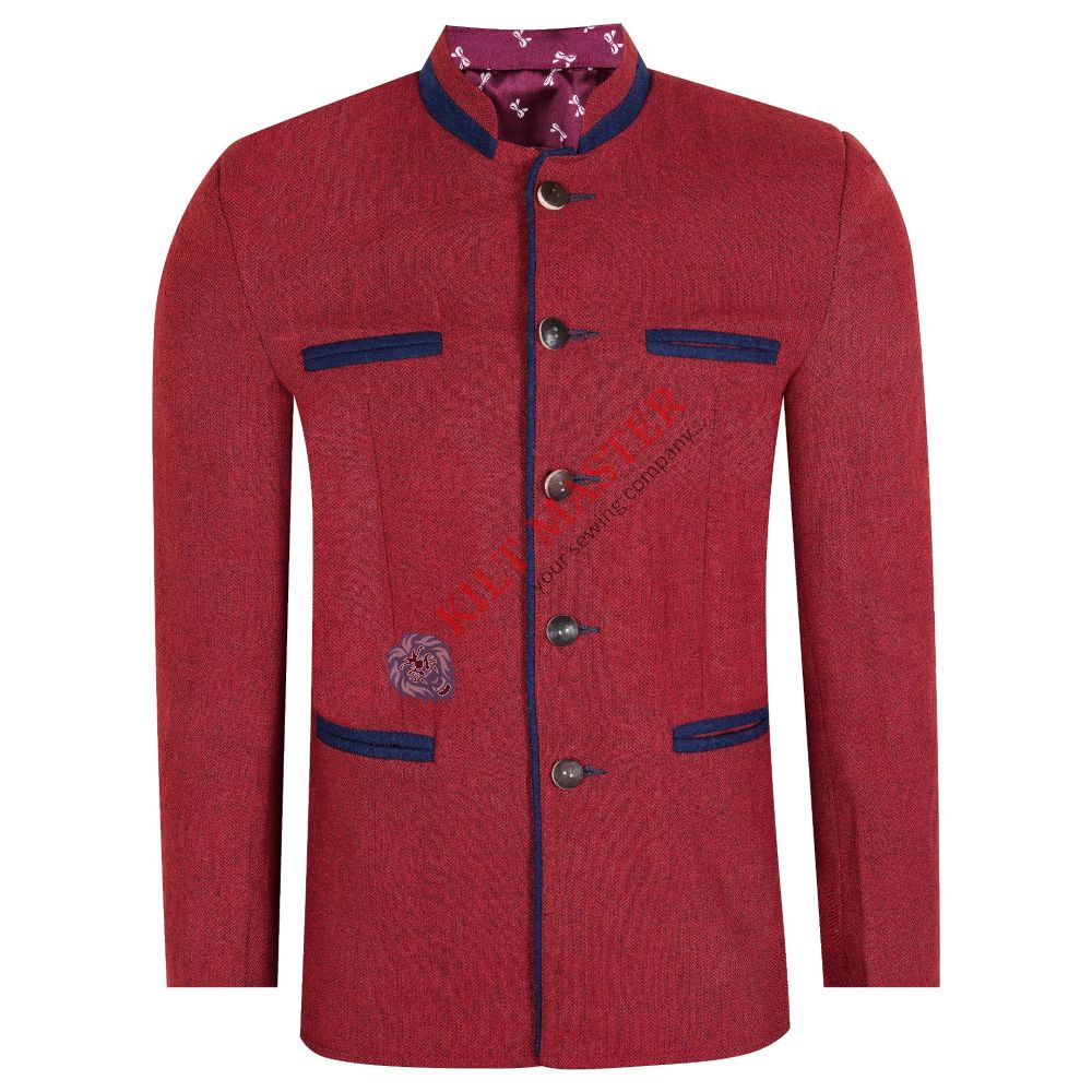 Material: Premium Red Tweed Fabric: Premium Quality Tweed Style: Bavarian Type: Traditional German Lining: Satin Fastening: Front buttons Pockets: Stylish welt pockets Collar: Stand-up with optional embroidery Cuffs: Contrasted accents Inside Pockets: Two secure compartments Size: Made to Order