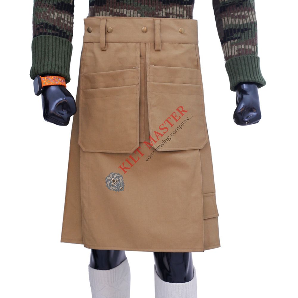This versatile khaki working kilt features multiple pockets designed for practicality. You will find several spacious pockets that can hold tools, phones, keys, and other essentials. These multi pockets make it easy to organize your items and keep them within reach. The utility design enhances functionality, making it a favorite for work, outdoor activities, or casual wear.