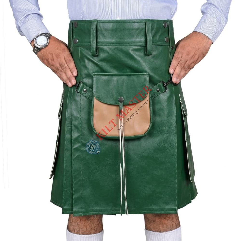 Green Leather Utility Kilt is a bold and stylish choice made from genuine leather. Durable, comfortable, and adjustable, it is perfect for events, casual wear, and modern Highland fashion.