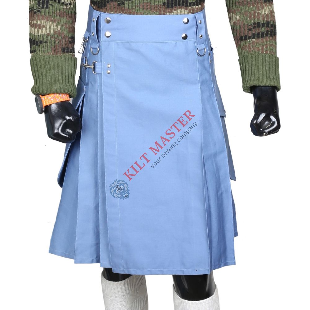 Light sky blue utility kilt made for comfort and modern style. A strong mens kilt, perfect for daily wear and work use, ideal choice among kilts for men.