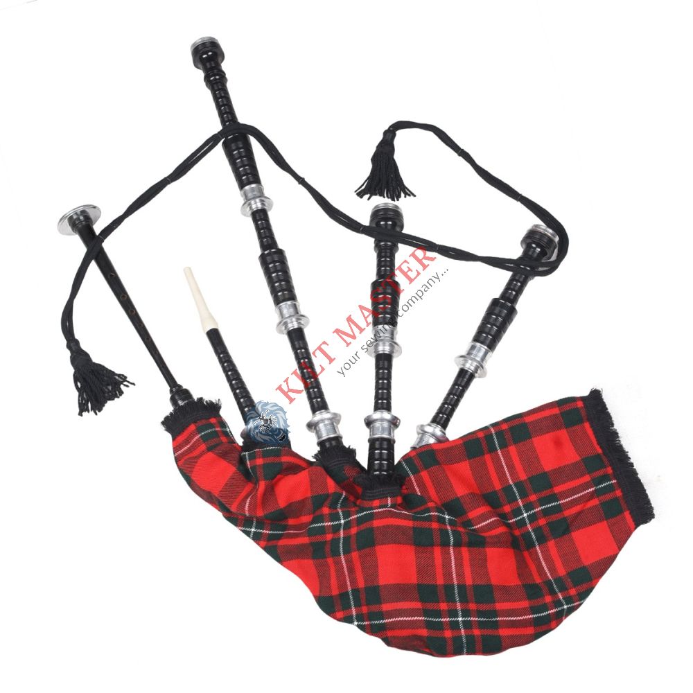 TheBlack Finish Macgregor Tartan Scottish Bagpipe is made from real rosewood with a shiny black finish. It has ivory-style mounts, silver-colored metal parts, and a plastic mouthpiece. The bag cover features the traditional Macgregor Tartan. It is fully handmade and gives a rich, professional sound. Comes with synthetic drone reeds and two sets of cane chanter reeds.