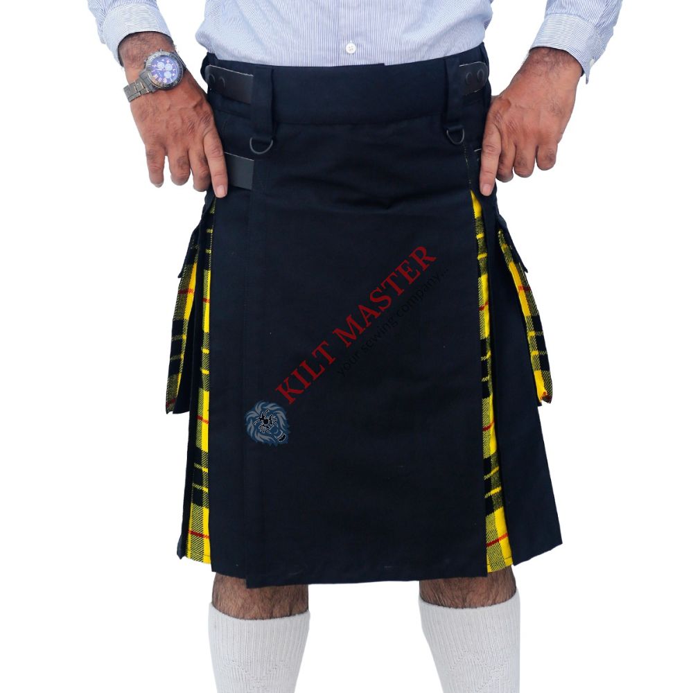 The Macleod of Lewis and Black Hybrid Kilt combines tradition with a modern twist. Perfect for those who love bold fashion. The striking Macleod tartan, with its bright yellow and black pattern, adds a vibrant touch. Paired with solid black fabric, it creates a balanced, stylish look.