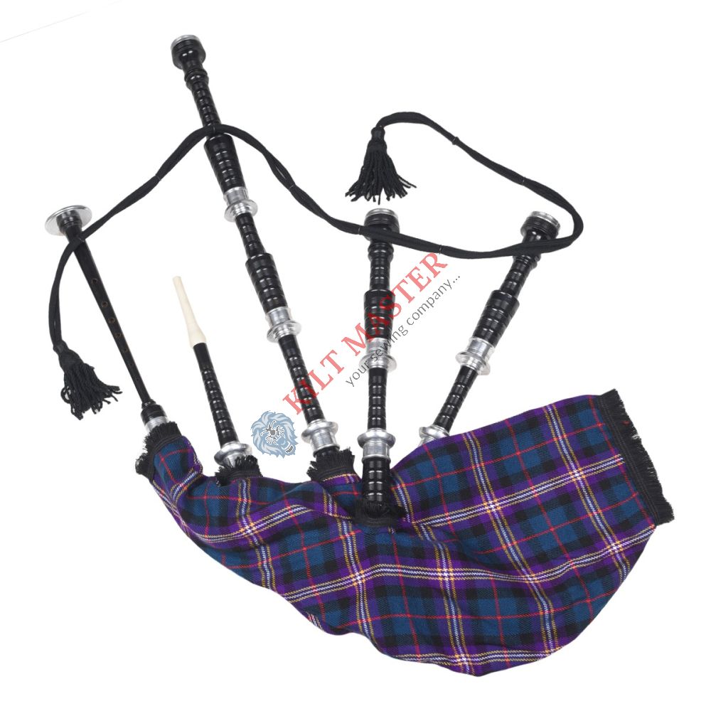 The Black Finish Masonic Tartan Scottish Bagpipe is a finely crafted instrument with a sleek black finish, imitation ivory mounts, and a durable mouthpiece, offering traditional Scottish elegance and quality sound.