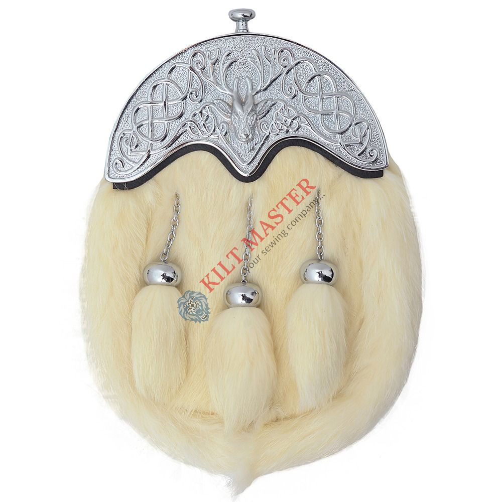 Material: Genuine White Rabbit Fur Color: White Style: Modern Thistle Cantle Type: Scottish/Highland Tassels: 3 Fastening: Inside Button Attachment: Leather Straps and Chain Hardware: Silver Chrome Size: Adult and Adjustable