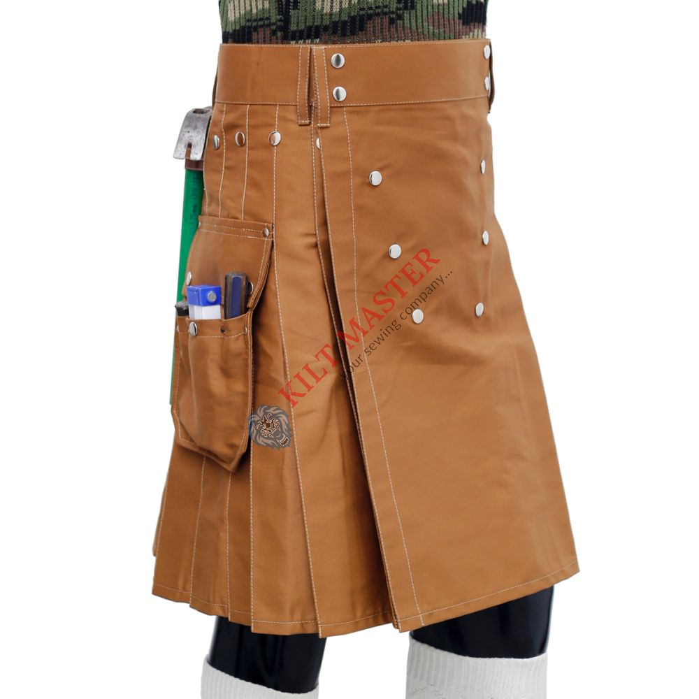 Material: 100% Cotton Color: Khaki Style: Utility Kilt Type: Working/Highland Pockets: Multiple Utility Pockets Decorated: Front Apron with buttons Fastening: Studded buttons for secure fit Hardware: Customize Belt Loops: Yes Size: Custom-made to fit your measurements