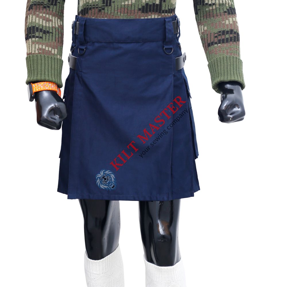Made from 100% cotton, this Navy Blue Utility Kilt is both stylish and functional. The kilt features a rich navy blue fabric that’s perfect for casual wear, events, or even work. The utility design includes two large side pockets with flaps and buttons, giving you plenty of space to carry essentials. Leather straps add a touch of rugged sophistication and help adjust the fit for comfort. With sturdy belt loops and durable hardware, this kilt is made to last while offering versatile style. Order your custom Navy Blue Utility Kilt today and stand out with ease.