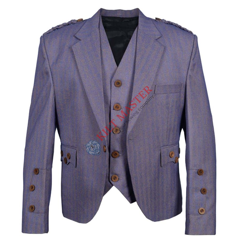 Material: 100% Wool Fabric: Tweed Style: Argyle Type: Scottish/Highland Lining: Satin Buttons: Bone Fastening: 1 Button Chest Pocket: 1 on Left Side Side Pockets: Flapped with 3 Buttons Each Epaulets: Braided with 1 Button Cuffs Style: Argyle with 3 Buttons Each Inside Pockets: 2 Vest Buttons: 5 Vest Pockets: 2 Outside Vest Back: Satin with Waist Adjusting Belt Size: Made to Order The jacket’s satin lining and single-button closure add a touch of refinement, while the 5-button vest, complete with two outer pockets and an adjustable satin back, ensures a tailored fit for any occasion.