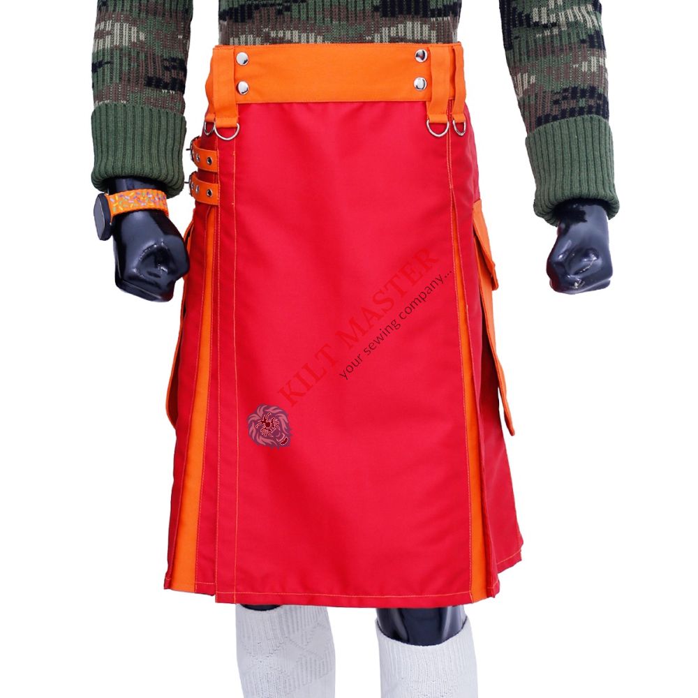 Red and Orange Hybrid Utility Kilt offers a bold and practical style for everyday wear.