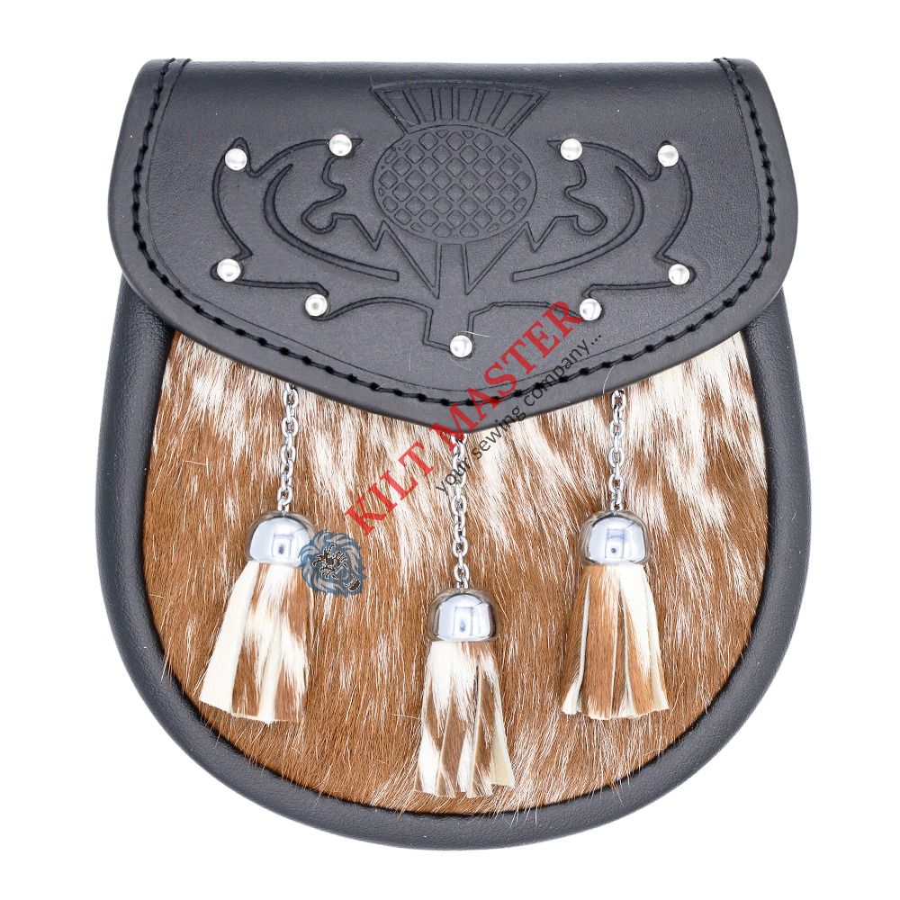 Material: Genuine Leather Color: Brown Style: Embossed Type: Scottish/Highland Tassels: 3 Fastening: Inside Button Attachment: Leather Straps and Chain Hardware: Silver Chrome Size: Adult and Adjustable