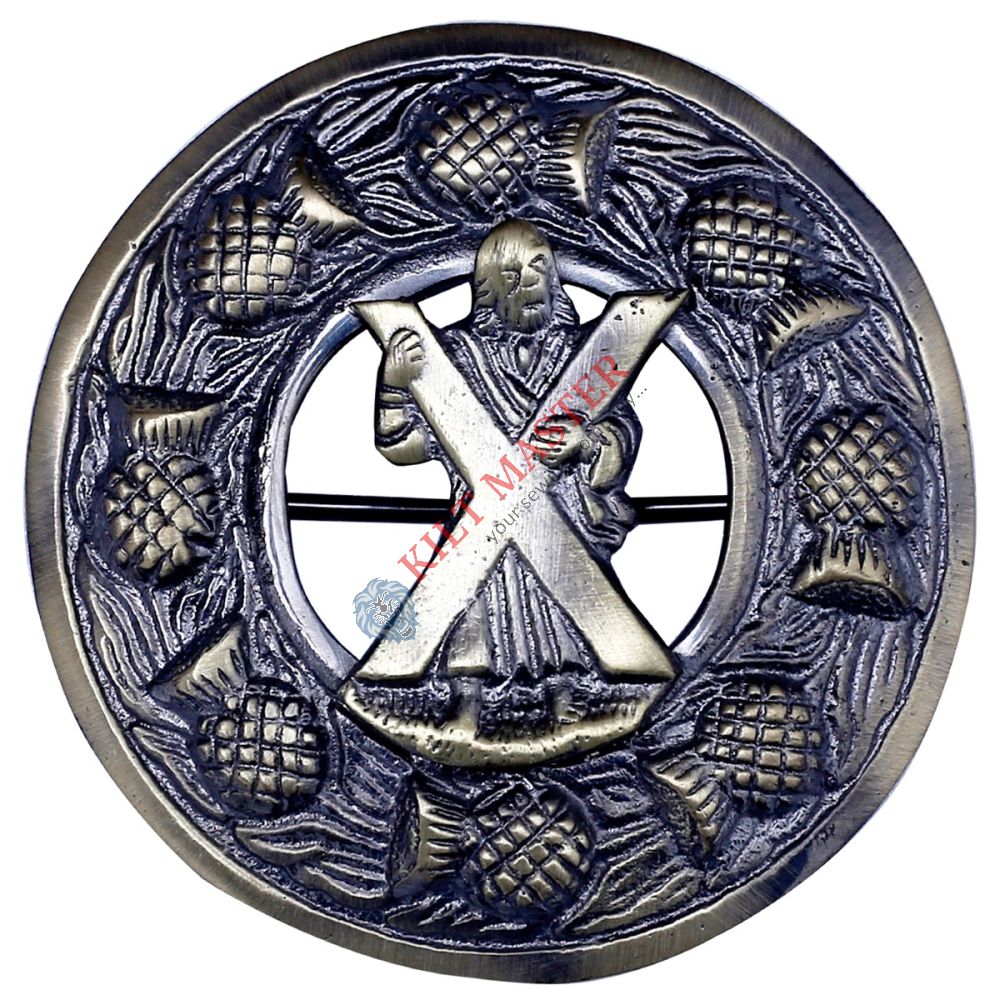 Material: Metal/Pewter Finish: Antique Design: Saint Andrew Badge Style: Kilt Fly Plaid Brooch Size: Standardd