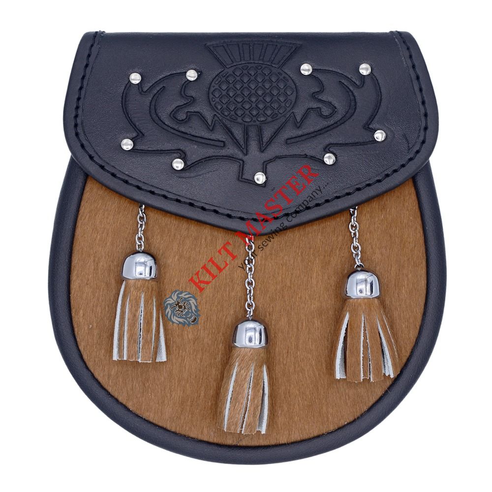 Material: Genuine Leather Color: Black and Caramel Brown Style: Embossed Type: Scottish/Highland Tassels: 3 Fastening: Inside Button Attachment: Leather Straps and Chain Hardware: Silver Chrome Size: Adult and Adjustable