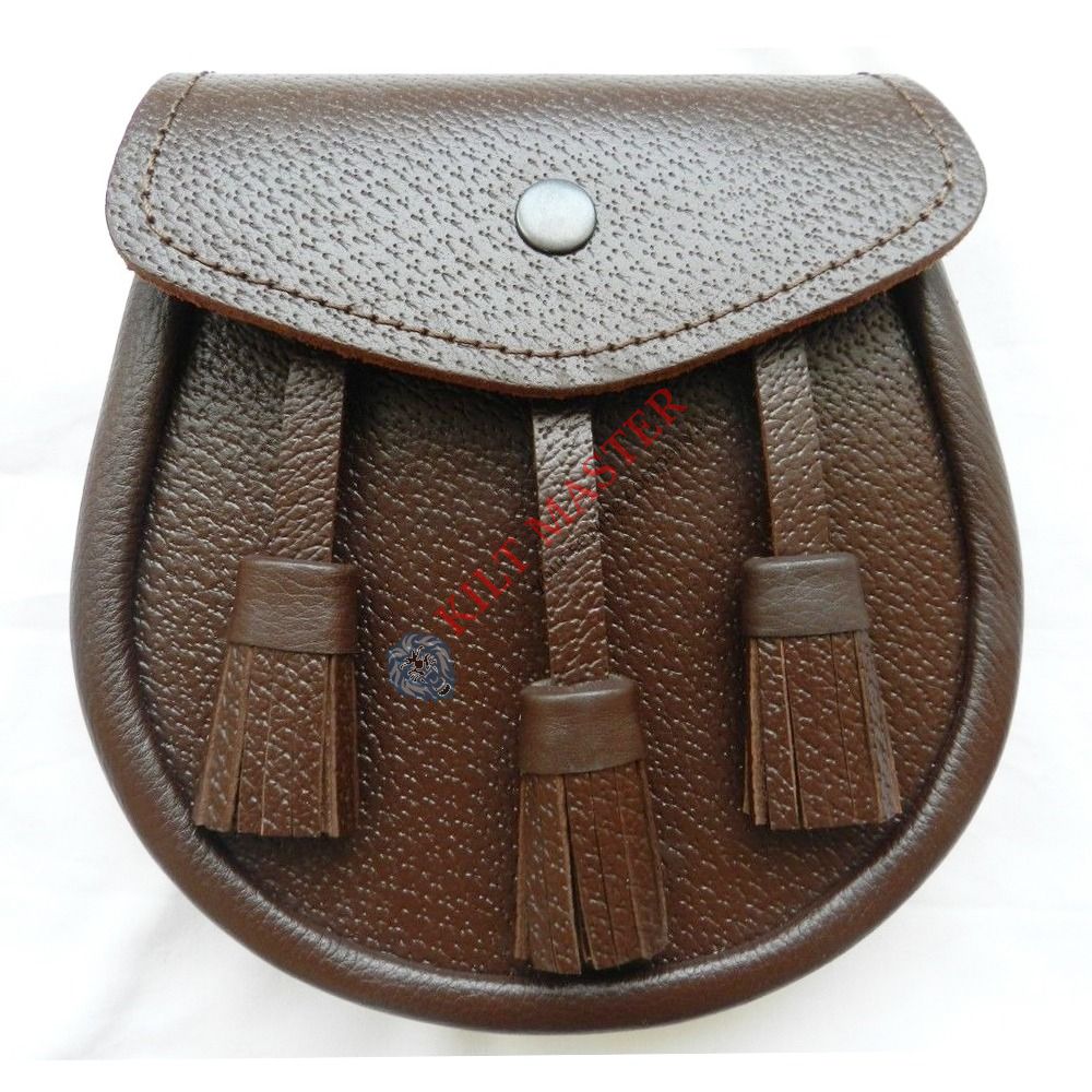 Material: Genuine Leather Color: Brown Style: Embossed Type: Scottish/Highland Tassels: 3 Fastening: Inside Button Attachment: Leather Straps and Chain Hardware: Silver Chrome Size: Adult and Adjustable