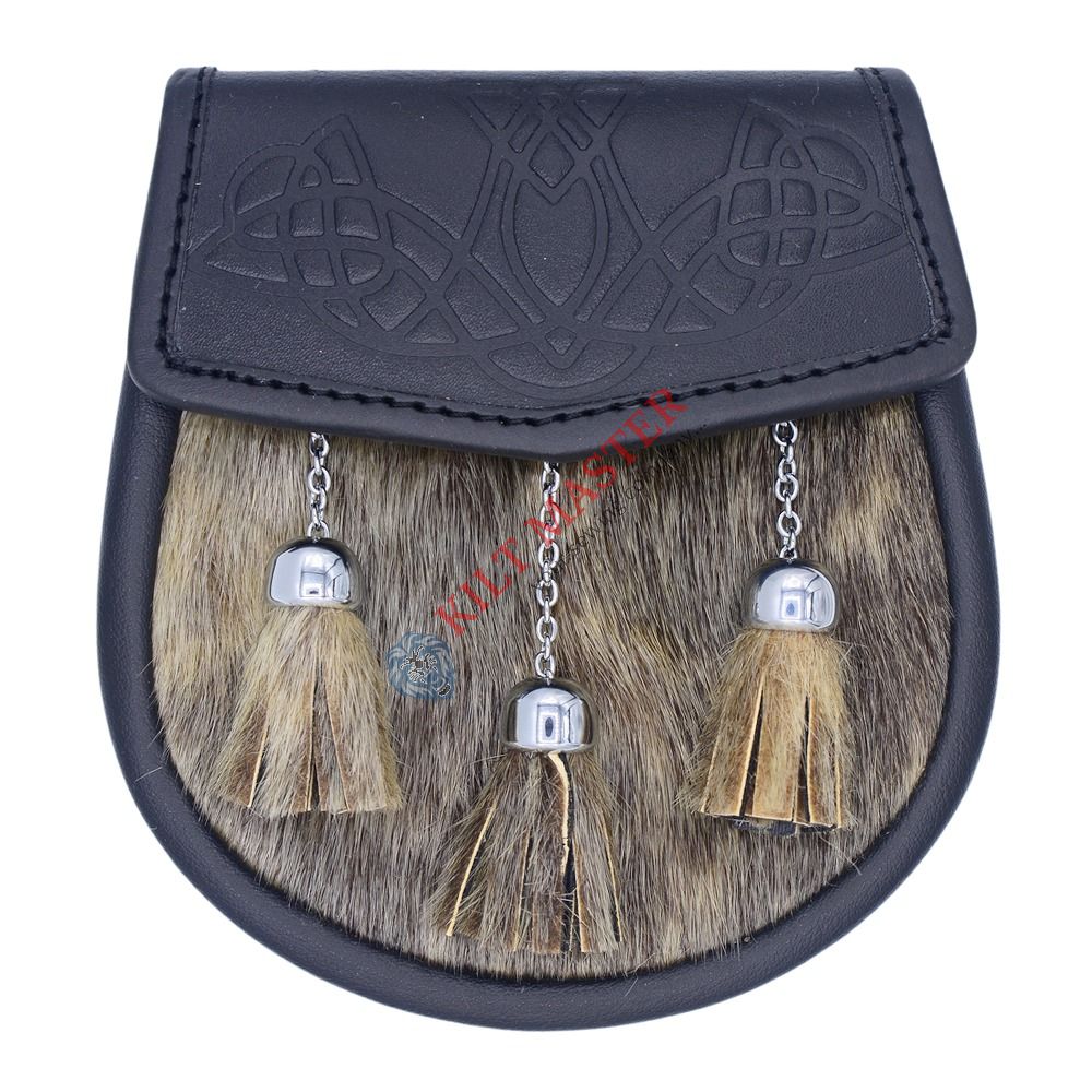 Material: Genuine Sealskin and Leather Color: Natural Style: Celtic Design Embossed Type: Scottish/Highland Tassels: 3 Fastening: Inside Button Attachment: Leather Straps and Chain Hardware: Silver Chrome Size: Adult and Adjustable