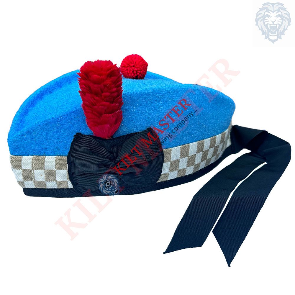 Our Scottish Clan Glengarry Hat is a classic Scottish accessory. Made with top-notch wool, it's both warm and comfortable. With a body color of Sky Blue and a black trim, our hat stands out. Its maroon pompom and feather hackle, light brown and white dicing, and black lining, all add to its unique design.