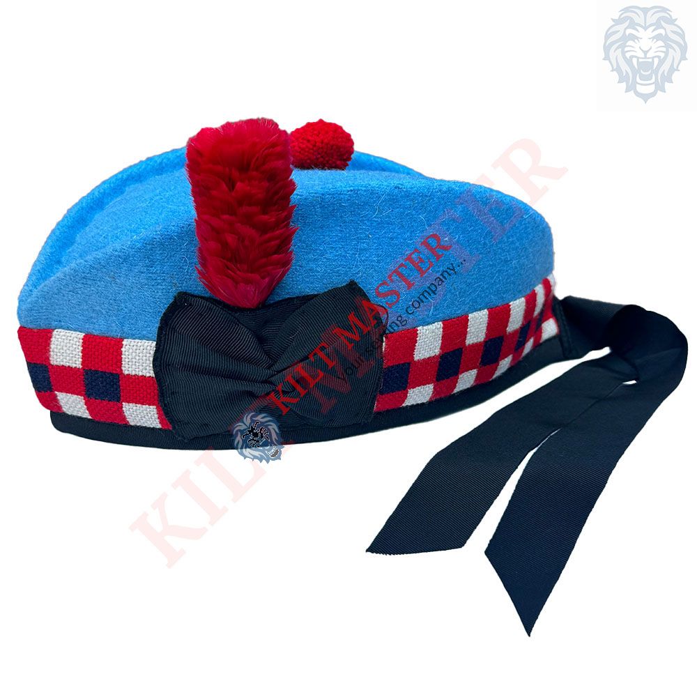 Take a look at the Scottish Classic Glengarry Hat. Made of top-notch wool, this hat has a traditional Scottish design. You'll spot a black cockade and maroon pom-pom that stand out against the sky blue wool body of the hat. The hat also sports a distinct pattern, known as 'dicing', in red, blue and white.