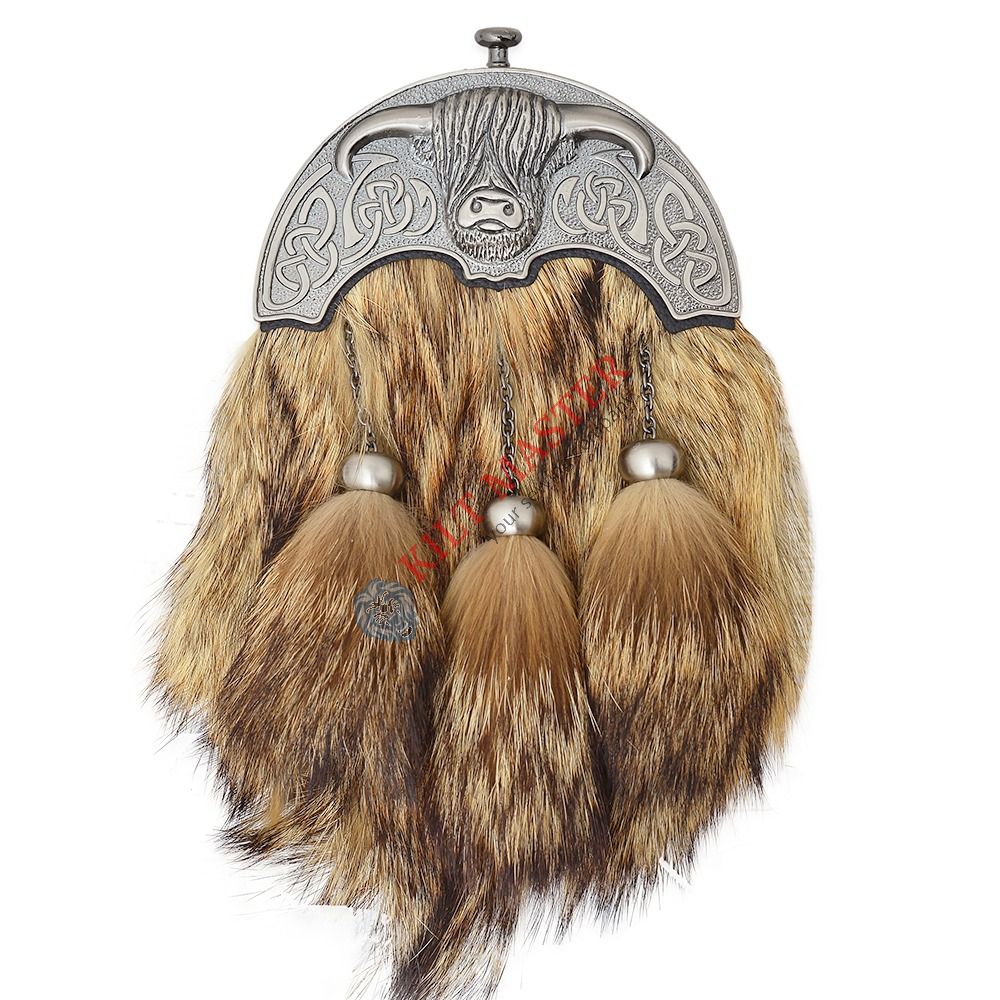 Material: Genuine Fox Fur Color: Natural Fox Fur Style: Full Dress Type: Scottish/Highland Tassels: 3 Fastening: Inside Button Attachment: Leather Straps and Chain Hardware: Silver Chrome Size: Adult and Adjustable