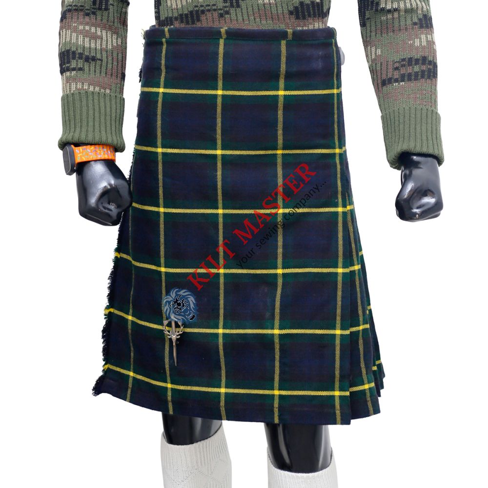 The Scottish Gordon Tartan Kilt is a stunning piece of Scottish heritage. Its dark green and navy pattern with yellow lines is both classic and stylish. Made from high-quality wool, this kilt offers comfort and durability. The fabric keeps its shape, even with wear. Proudly wear this kilt and honor the Gordon clan's legacy. Perfect for any occasion.