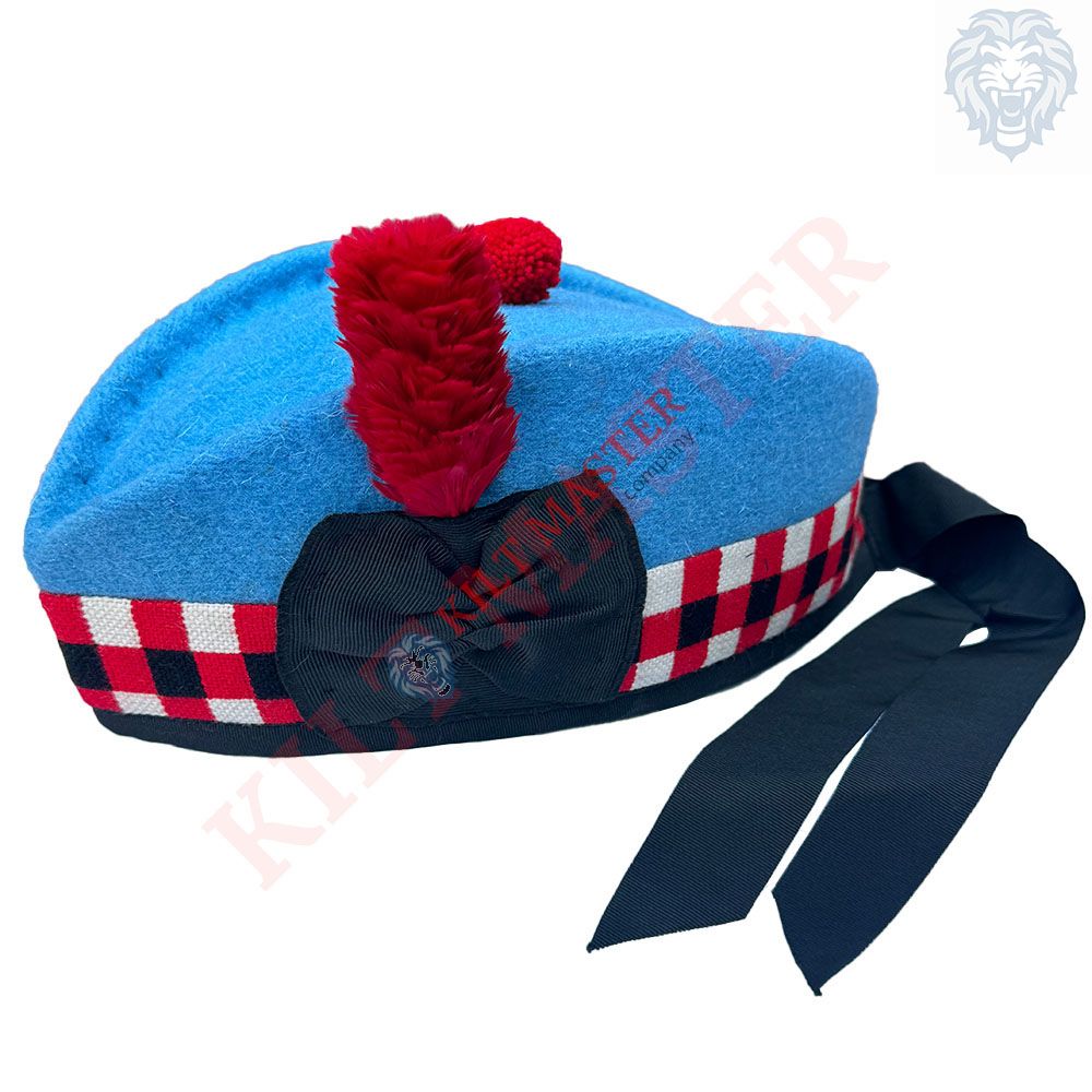 The Scottish Highland Dress Glengarry Hat is made from 100% premium wool. Known for its sky blue wool body, it has striking red, black, and white dicing. The hat is decorated with a black cockade and maroon pompom. For a touch of elegance, a maroon feather hackle is attached.