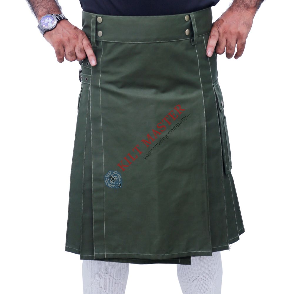 Features Material: 100% Cotton Fabric: Durable Drill Jeans Color: Olive Green Style: Utility Type: Scottish/Highland Side Pockets: Flapped with Buttons Fastening: Buttons / fabric Straps with Buckle Decorated: Customize Hardware: Select Any Option Size: Made to Order