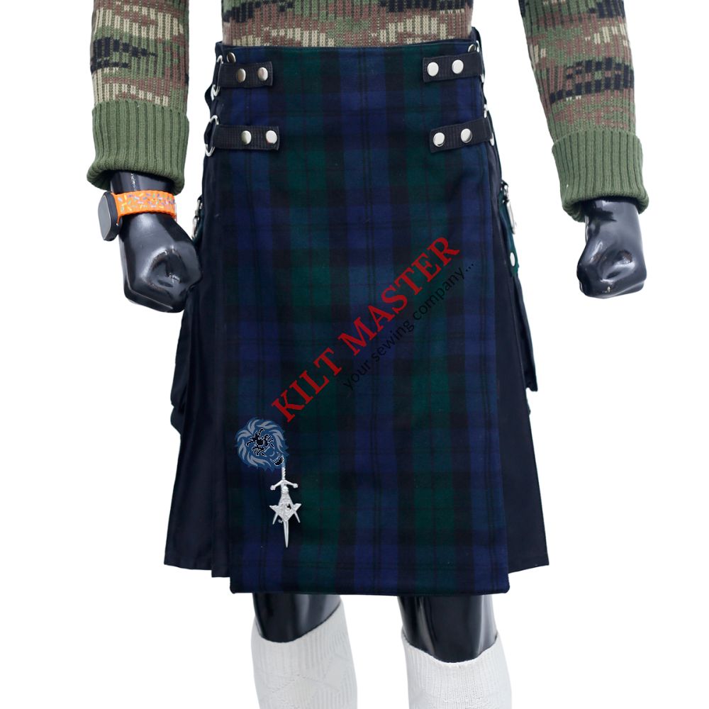 Features: Material: Cotton Tartan: Black Watch Style: Hybrid Pockets: Decorated Flapped with Buttons Type: Scottish/Highland Fastening: Straps with Buttons Hardware: Custamize Size: Made to Order