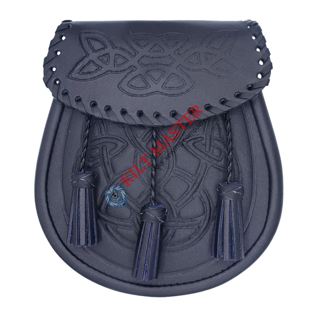 Elevate your kilt attire with this Black Leather Sporran, featuring a unique Celtic embossed pattern. Ideal for storage and enhancing Scottish traditional charm.